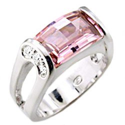 The beautiful emerald cut bridal ring is casted in Solid Sterling Silver. The CZ Stone is of High Quality, it is Hand Set and the Pink Tourmaline Colored CZ stone measures 9mm X 7mm, it is 2.5 Carat Size with smaller CZ stone on each side. It is Polished Finish with no Nickel or Rhodium Plating to Hide Imperfections. And because it is Not Plated, you won't have any problem of Peeling and Flaking and it is completely Hypoallergenic. This ring is Flawless! Available in sizes 6-10. (size 10)